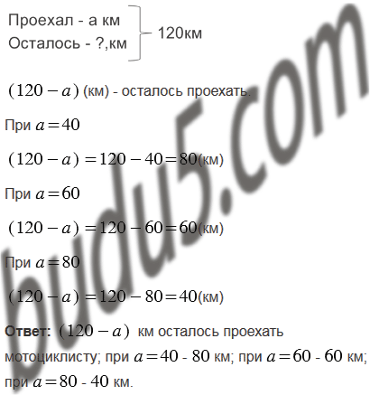 Мотоциклист едет из города в село, расстояние до которого 120 км. Сколько километров ему осталось проехать, если он уже проехал а км? Составьте выражение и найдите его значение при а = 40; 60; 80.