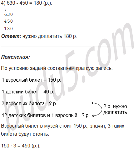 Взрослый билет в музей стоит 150 р., а детский (для школьника) - 40 р. Если вместо 3 взрослых билетов приобрести билеты на дюжину школьников (дюжина - 12) и одного взрослого сопровождающего, то сколько нужно доплатить в кассу?