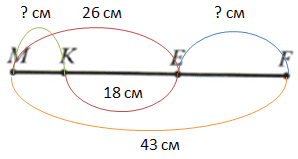 Известно, что MF= 43 см, МЕ = 26 см, КЕ = 18 см (рис. 24). Найдите длины отрезков МК и EF.
