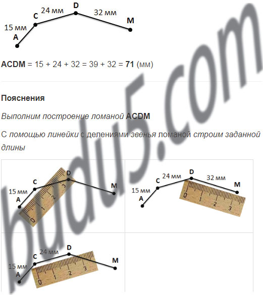 Постройте ломаную ACDM так, чтобы АС = 15 мм, CD = 24 мм, DM = 32 мм. Вычислите длину ломаной.