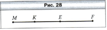 Известно, что MF = 30 см, ME = 18 см, KF = 22 см (рис. 28). Найдите длину отрезка КЕ.