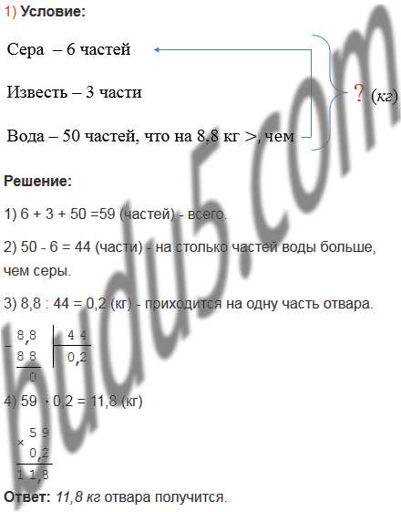 1) Для борьбы с вредителями садов готовится известково-серный отвар, состоящий из 6 частей серы, 3 частей негашёной извести и 50 частей воды (по массе). Сколько получится килограммов отвара, если воды взять на 8,8 кг больше, чем серы?