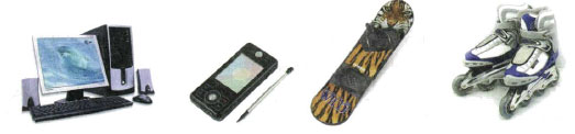 Компьютер: монитор, системный блок, клавиатура, колонки; мобильный телефон со стулусом; сноуборд; роликовые коньки.