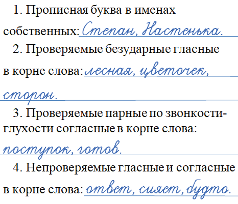 4. Непроверяемые гласные и согласные в корне слова: Поля́на, сия́ет, корабе́льщик.