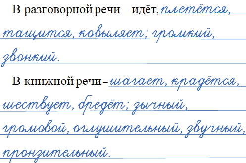 В разговорной речи – идёт, плетётся, тащится, ковыляет; громкий, звонкий.