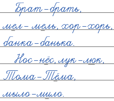 2) Нос - нёс, лук - люк, Тома - Тёма, мыло - мило.