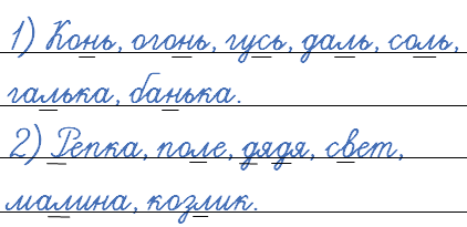 Репка, поле, конь, дядя, свет, огонь, гусь, дом, даль, малина, соль, коза, лошадка, козлик, галька, банька.
