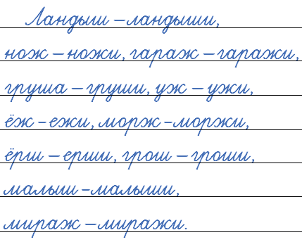 Чиж — чижи, ландыш — ..., нож — ..., гараж — ..., груша — ..., уж — ..., ёж — ..., морж — ..., ёрш — ..., грош — ..., малыш — ..., мираж — ...,