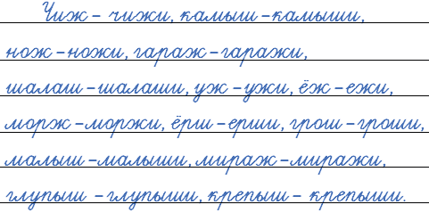 Чиж – чижи, камыш - …, нож - …, гараж - …, шалаш - …, уж - …, ёж - …, морж - …, ёрш - …, грош - …, малыш - …, мираж - …, глупыш - …, крепыш - … .