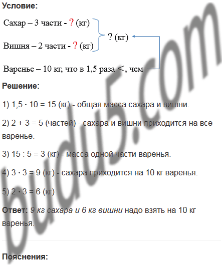 Для приготовления варенья из вишни на 3 части сахара берут 2 части ягод (по массе). Сколько килограммов сахара и сколько килограммов ягод надо взять, чтобы получить 10 кг варенья, если при варке его масса уменьшается в 1,5 раза?