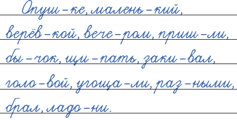 Леса (2 слога), вода (2 слога), сорока (3 слога), липа (2 слога), ясень (2 слога), ива (2 слога), товарищ (3 слога), погода (3 слога), скоро (2 слога), улица (3 слога), лопата (3 слога), пень (1 слог).