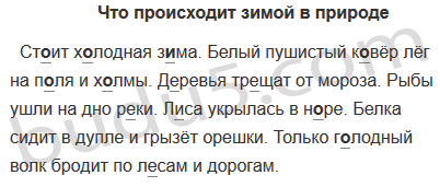 Ст..ит х..лодная з..ма. Белый пушистый ковёр лёг на п..ля и х..лмы. Д..ревья тр..щат от мороза. Рыбы ушли на дно р..ки. Л..са укрылась в н..ре. Белка сидит в дупле и грызёт орешки. Только г..лодный волк бродит по л..сам и дорогам.