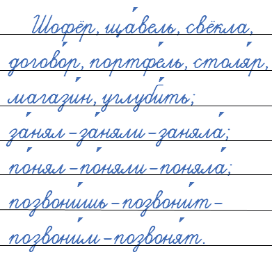 Шофёр, щавель, свёкла, договор, портфель, столяр, магазин, углубить; занял - заняли - заняла; понял - поняли - поняла; позвонишь - позвонит - позвоним - позвонят.