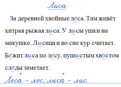 За деревней хвойные л..са. Там живёт хитрая рыжая л..са. У л..сы ушки на макушке. Л..сица и во сне кур считает. Б..жит л..са по́ л..су, пуш..стым хв..стом сл..ды заметает.
