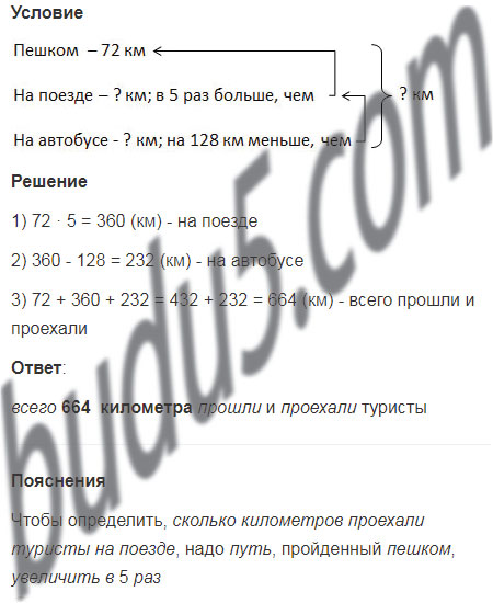 Группа туристов прошла пешком 72 км, проехала на поезде расстояние в 5 раз большее, чем прошла пешком, а на автобусе проехала на 128 км меньше, чем на поезде. Сколько всего километров прошли и проехали туристы?