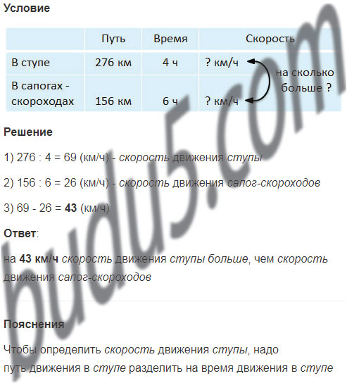 Отправившись в гости к Змею Горынычу, Баба-яга пролетела в своей ступе 276 км за 4 ч, а остальные 156 км прошла за 6 ч в сапогах-скороходах. На сколько скорость движения ступы больше, чем скорость движения сапог-скороходов?