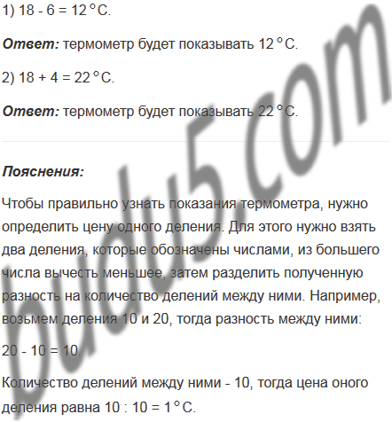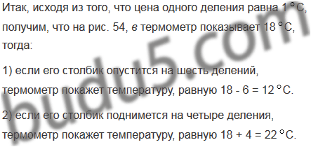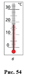 Какую температуру будет показывать термометр, изображенный на рисунке 54, в, если его столбик: 1) опустится на шесть делений; 2) поднимется на четыре деления?