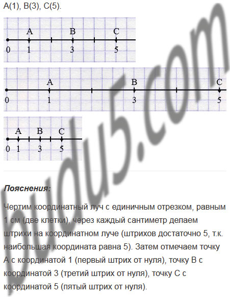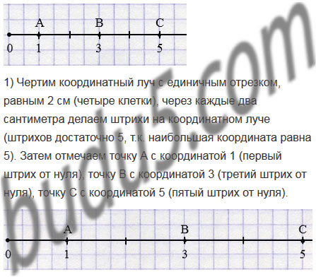 Отметьте на координатном луче точки, соответствующие числам 1, 3, 5, если единичный отрезок равен 1 см. Начертите еще два координатных луча и отметьте на них эти же числа, выбрав за длину единичного отрезка: 1) 2 см; 2) 5 мм.