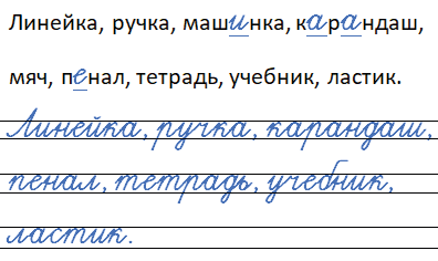 Линейка, ручка, маш_нка, к_р_ндаш, мяч, п__нал, тетрадь, учебник, ластик.