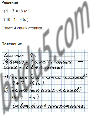 1. В кафе стояли красные, жёлтые и синие столики. Красных столиков было 9, жёлтых — на 7 столиков больше, чем красных, а синих — в 4 раза меньше, чем жёлтых. Сколько синих столиков было в кафе?