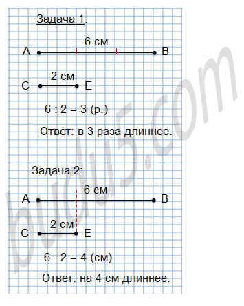 1) Во сколько раз отрезок АВ длиннее отрезка СЕ? Запиши решение, а затем покажи его на чертеже.