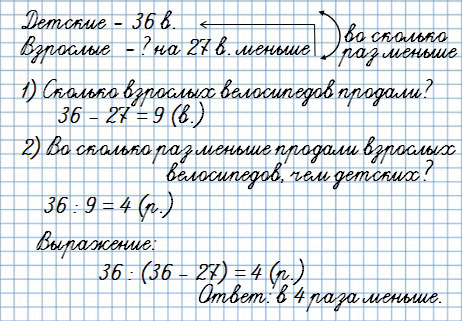 2. За день в магазине продали 36 детских велосипедов, а взрослых велосипедов на 27 меньше. Во сколько раз меньше продали взрослых велосипедов, чем детских?