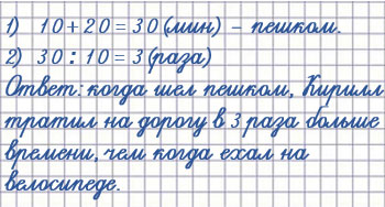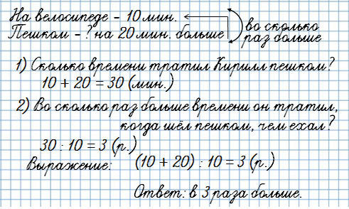 3. Кирилл тратил на дорогу до стадиона на велосипеде 10 мин, а пешком на 20 мин больше. Во сколько раз больше времени он тратил, когда шёл пешком, чем когда ехал на велосипеде?