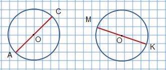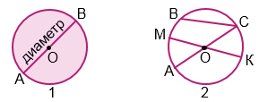 На рисунке 2 диаметры отрезки АС и МК, отрезок ВС не проходит через центр окружности, а значит, не является диаметром.