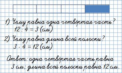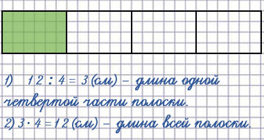 2) Длина одной четвёртой части полоски равна 3 см. Как узнать длину всей полоски?