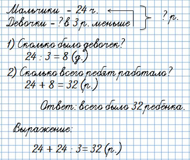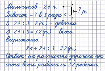 2. Ребята расчищали от снега дорожки около школы. Мальчиков было 24, а девочек — в 3 раза меньше. Сколько всего ребят работало на расчистке дорожек от снега?