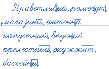 Пр..ветливый‚ п..могут‚ м..газины, антен..а‚ капус..ный, вкус..ный, прелес..ный, жуж..ит, бас..ейны.