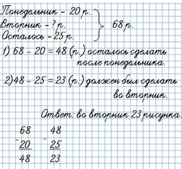 134. Художнику надо было сделать 68 рисунков к мультфильму. После того как он сделал 20 рисунков в понедельник и несколько рисунков во вторник, ему осталось сделать 25 рисунков. Сколько рисунков художник сделал во вторник?