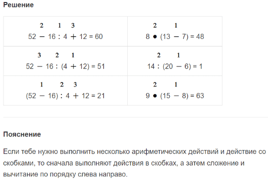Вспомни порядок выполнения действий при нахождении значения числовых выражений со скобками и без них.