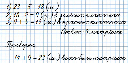 165. На полке стояло 23 матрёшки в красных и зелёных платочках. Сколько было матрёшек в зелёных платочках, если матрёшек в красных платочках было на 5 больше, чем в зелёных?