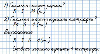 149. Даша купила 3 ручки, заплатив по 8 р. за каждую. Сколько тетрадей можно купить на эти деньги, если одна тетрадь стоит 6 р.?