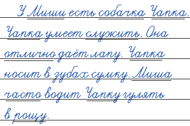 У Миши есть собачка Чапка. Чапка умеет служить. Она отлично даёт лапу. Чапка носит в зубах сумку. Миша часто водит Чапку гулять в рощу.