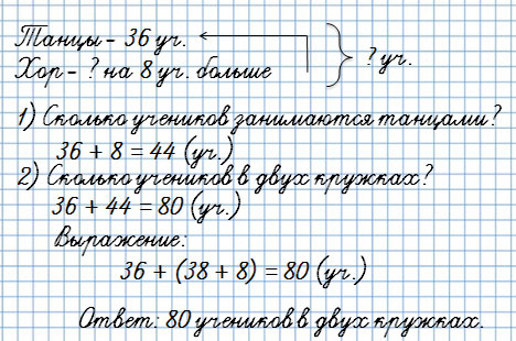 В танцевальном кружке 36 учеников, а в школьном хоре - на 8 учеников боль­ше. Сколько учеников занимаются танцами и пением?