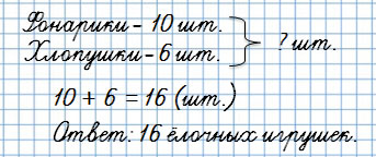 5. Дети сделали 10 фонариков и 6 хлопушек. Сколько всего ёлочных игрушек они сделали?
