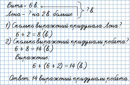 4. Витя придумал 6 выражений со скобками, значение которых равно 15, а Лена придумала на 2 таких выражения больше. Поставь вопрос и реши задачу.