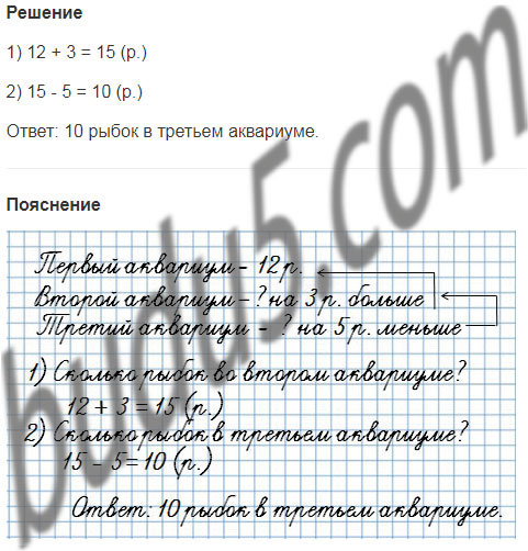 2. В первом аквариуме 12 рыбок, во втором — на 3 рыбки больше, чем в первом, а в третьем — на 5 рыбок меньше, чем во втором. Сколько рыбок в третьем аквариуме?