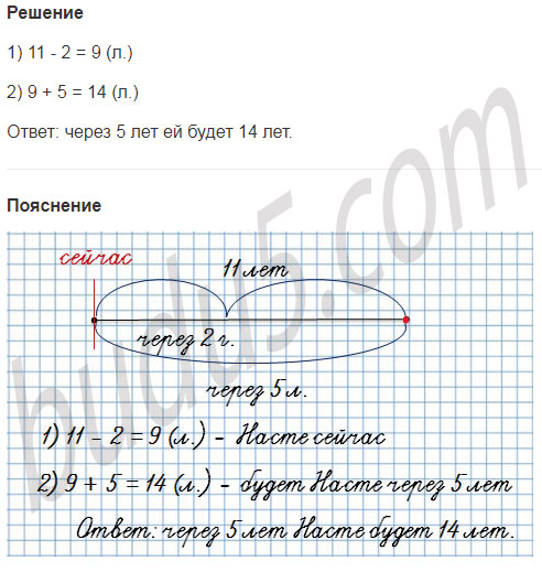 4. Через 2 года Насте будет 11 лет. Сколько лет будет Насте через 5 лет?