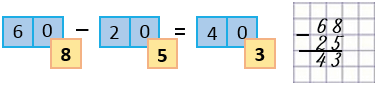 При вычитании 68 - 25 в столбик рассуждай так: