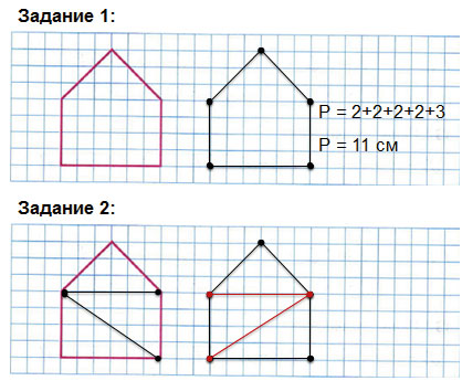 1) Начерти ещё один такой же пятиугольник. Найди его периметр.