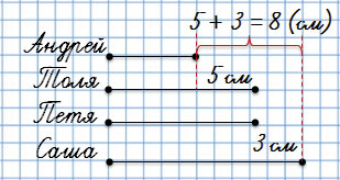 Толя выше Андрея на 5 см. Петя такого же роста, что и Толя, но он на 3 см ниже Саши. На сколько сантиметров Саша выше, чем Андрей? Сделай схематический чертёж и по нему запиши ответ.