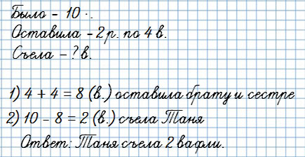На тарелке было 10 вафель. Таня съела несколько вафель и оставила по 4 вафли для сестры и брата. Сколько вафель съела Таня?