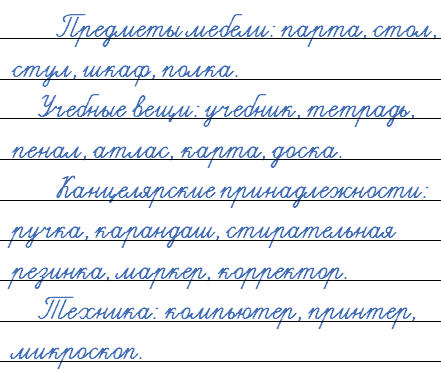 Назовите словами все предметы в классной комнате. Запишите слова. Какие словосочетания обозначают сразу все группы предметов?
