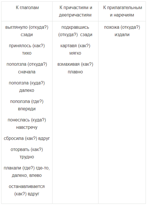 Образец. К глаголам | К причастиям, деепричастиям взмахивая (как?) плавно | K прилагательным и наречиям