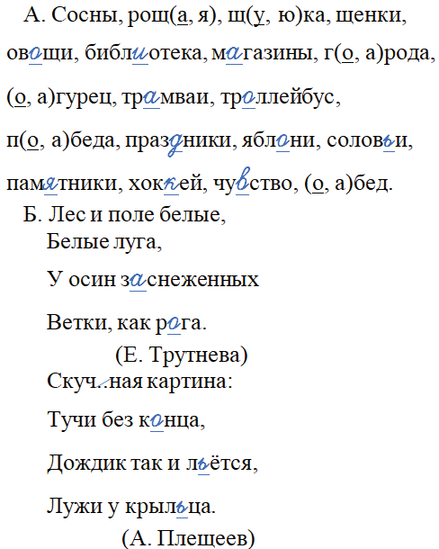 А. Сосны, рощ(а, я), щ(у‚ ю)ка, щенки, овощи‚ библиотека, магазины‚ г(о‚ а)рода, (о, а)гурец, трамваи‚ троллейбус‚ п(о‚ а)беда, праздники‚ яблони‚ соловьи, памятники‚ хоккей‚ чувство‚ (о, а)бед.
