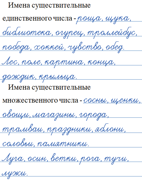 Имена существительные единственного числа - роща, щука, библиотека, огурец, троллейбус, победа, хоккей, чувство, обед.| лес, поле, картина, конца, дождик, крыльца.