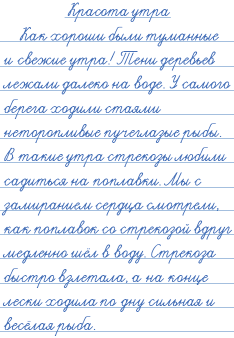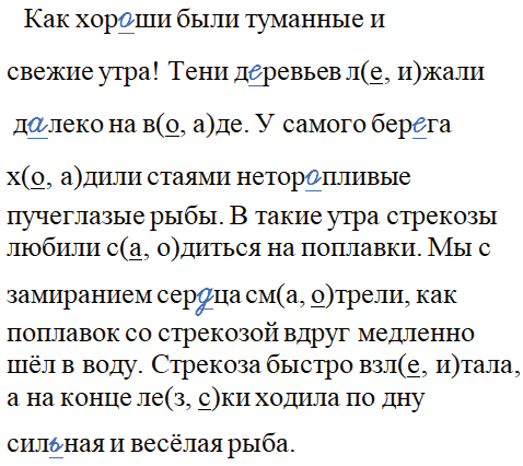 Как хор..ши были туманные и свежие утра! Тени д..ревьев л(е‚ и)жали д..леко на в(о, а)де. У самого бер..га х(о‚ а)дили стаями нетор..пливые пучеглазые рыбы. В такие утра стрекозы любили с(а‚ о)диться на поплавки. Мы с замиранием сер..ца см(а, о)трели, как поплавок со стрекозой вдруг медленно шёл в воду. Стрекоза быстро взл(е‚ и)тала‚ а на конце ле(з, с)ки ходила по дну сил..ная и весёлая рыба.